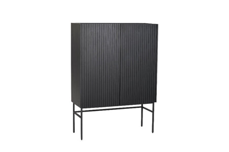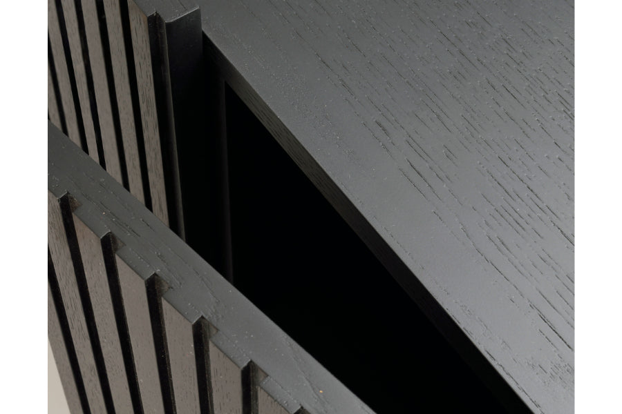 Halifax cabinet in black lacquered oak with black metal legs. The surface consists of solid acrylics on veneers and has two practical shelves, one of which is adjustable. The doors have a soft-closing function.