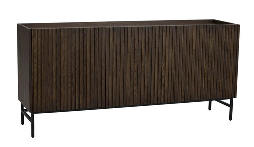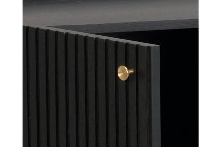 Halifax sideboard in black lacquered oak with black metal legs. The surface consists of solid acrylics on veneers and has a practical shelf. The doors have soft-close function.