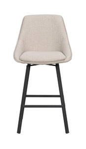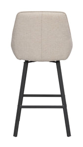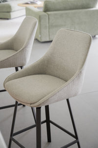 Es verfügt über einen um 360 Grad drehbaren Sockel und ist mit elegantem beigem Stoff gepolstert, perfekt für moderne Küchen- oder Barumgebungen.