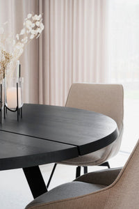 Ein runder Esstisch aus massiver schwarzer Esche.