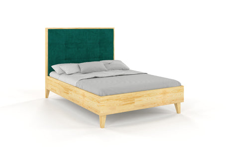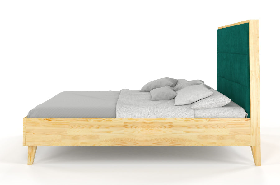 Das Kiefernholzbett FRIDA wurde für Menschen entwickelt, die auch tagsüber gerne im Bett entspannen. FRIDA ist ein elegantes Möbelstück. Es verfügt über eine hohe Kopfstütze mit einem dicken Holzrahmen, dessen Vorderseite mit einem angenehm anzufassenden Veloursstoff bezogen ist. Die Polsterung ist rechteckig gesteppt. Auf der Kopfstütze können Sie sich auf dem Kissen ausruhen und auch lange lesen oder fernsehen. Trotz der hohen Kopfstütze (130 cm) ist die Konstruktion sehr stabil und robust.