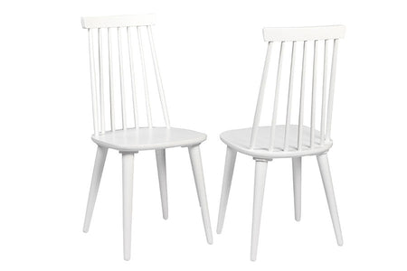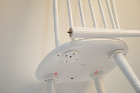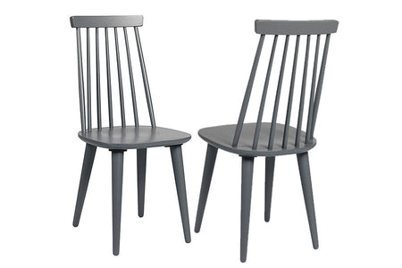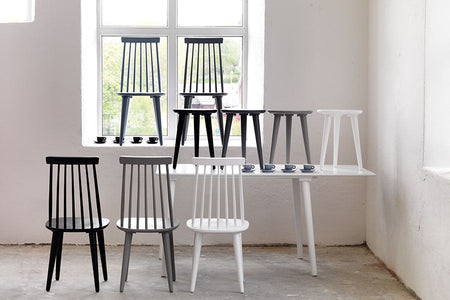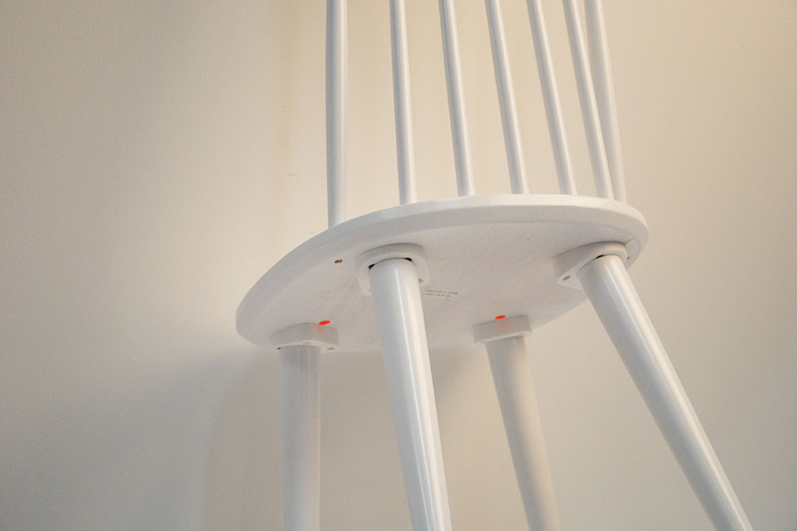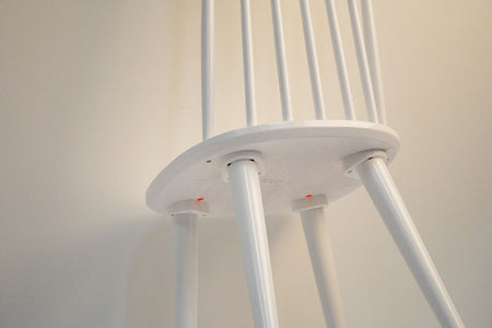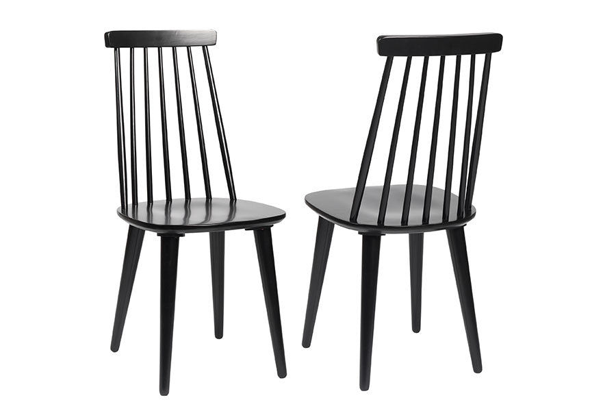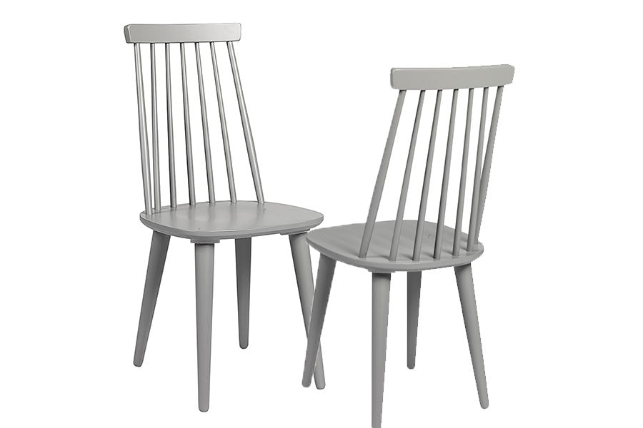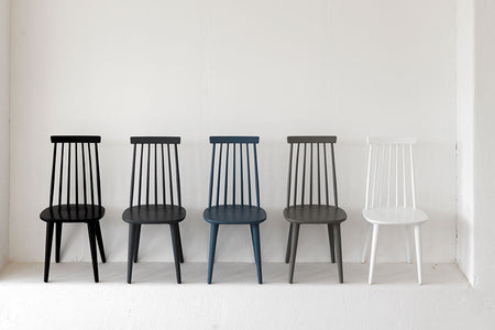Stuhl im Windsor-Stil aus lackiertem Holz. Strapazierfähig und leicht sauber zu halten. Stabile Konstruktion mit vier Beinen und leicht konturierter Sitzfläche.